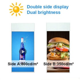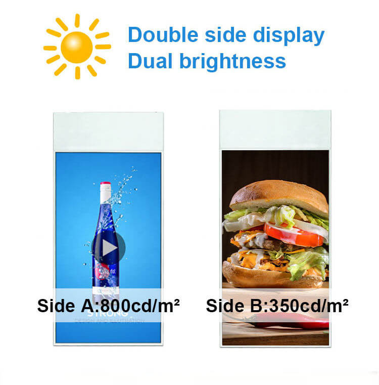 Hanging double-sided display digital signage, 43“, 49”, 55”, 700 nit on one side, 350 Nit on the other side, ultra-thin 20 mm thickness, Android system memory 2g and 16g, Internet remote switch, remote software operation screen to change the content, wake up LCD screen, resolution 1920*1080. Screen weight 32 kg, support customized pattern LOGO, used in supermarkets, shopping malls, department stores, hotels, high-speed rail, airports and so on. Hotels, high speed trains, airports, etc. We are the distributor. We have professional production technology and high quality team. High quality and low price.