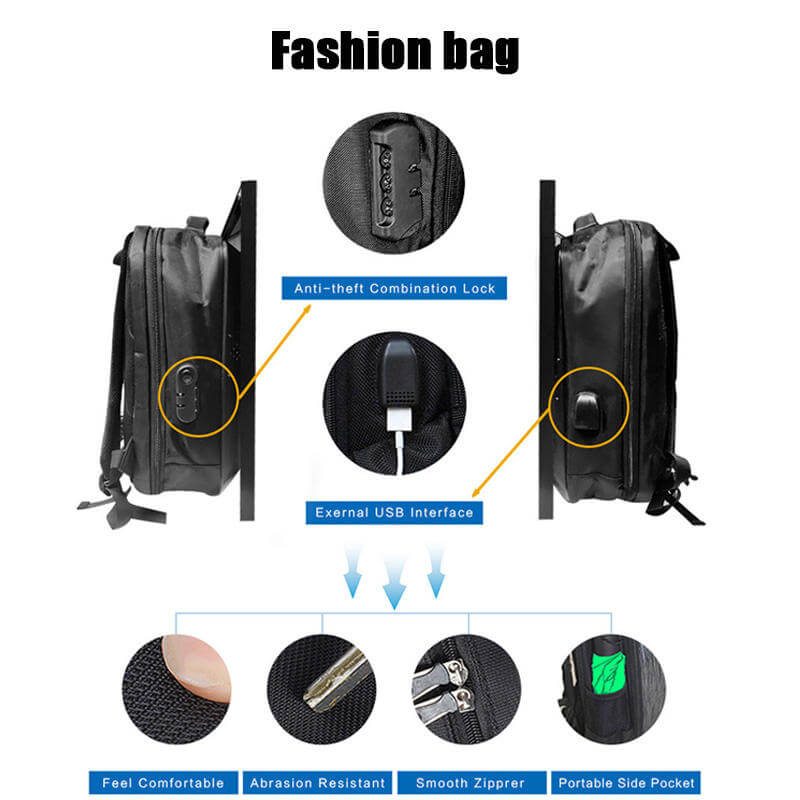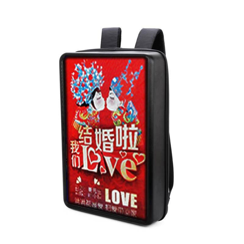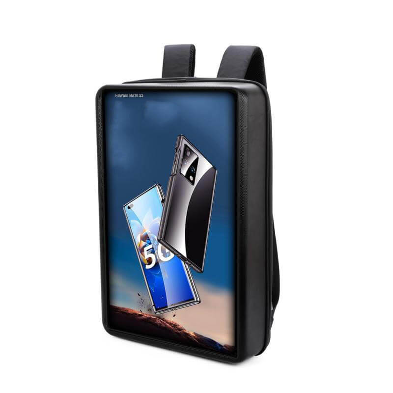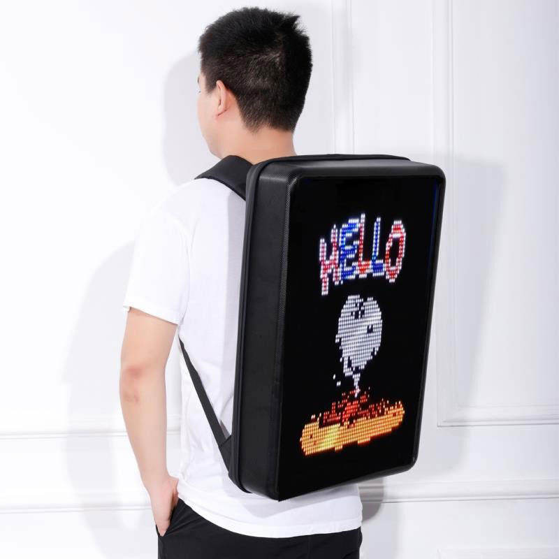 Express yourself with the portable advertising Walking Billboard Backpack that is customizable to display any text, GIF animation, widget or image through an easy mobile app.