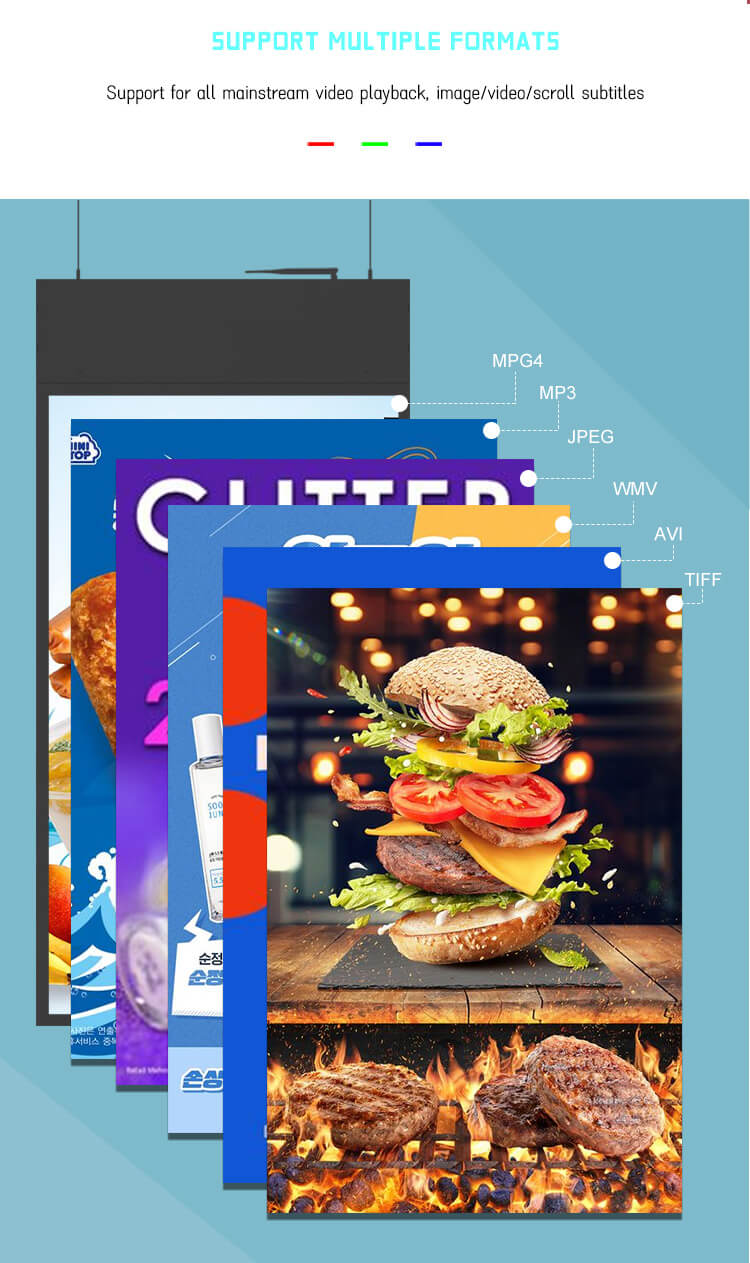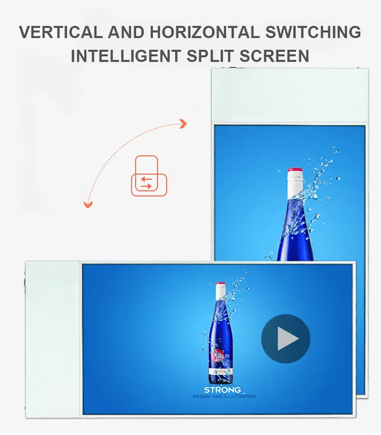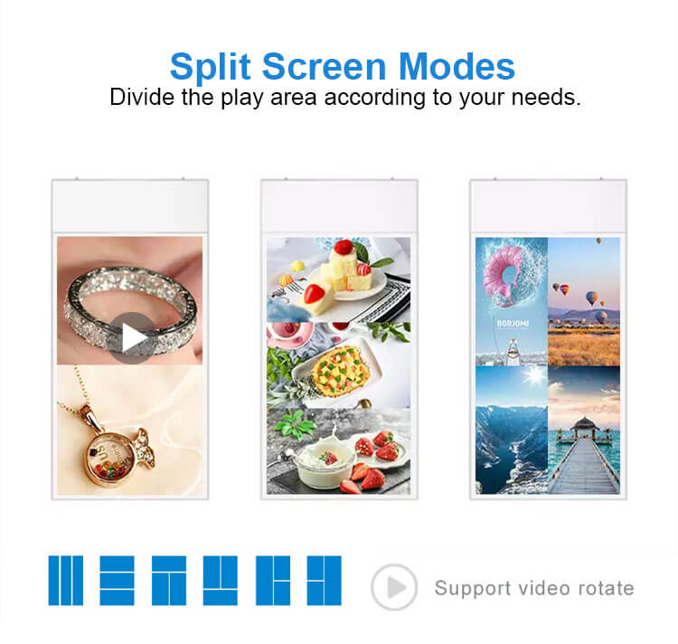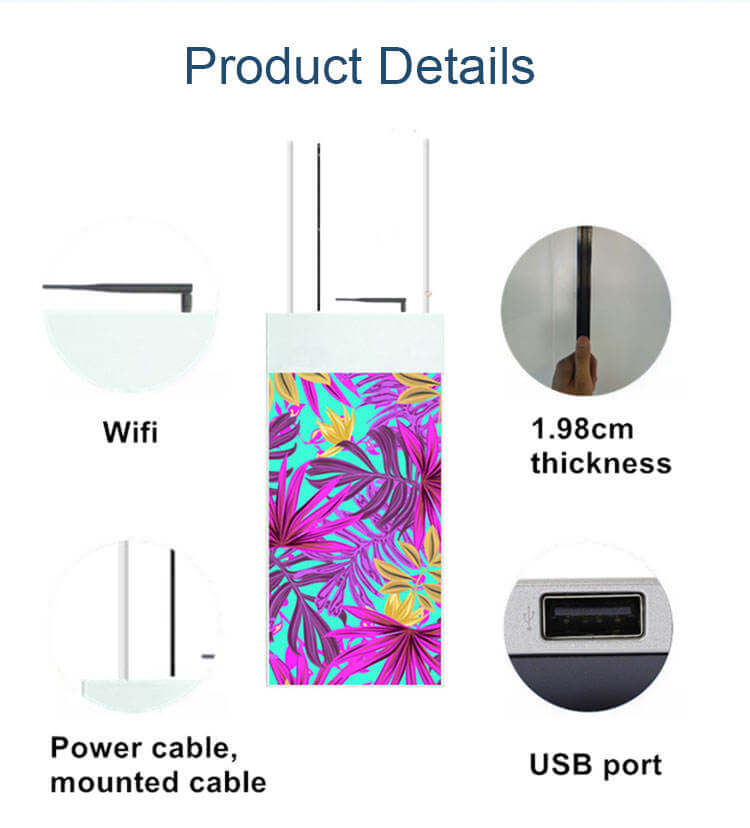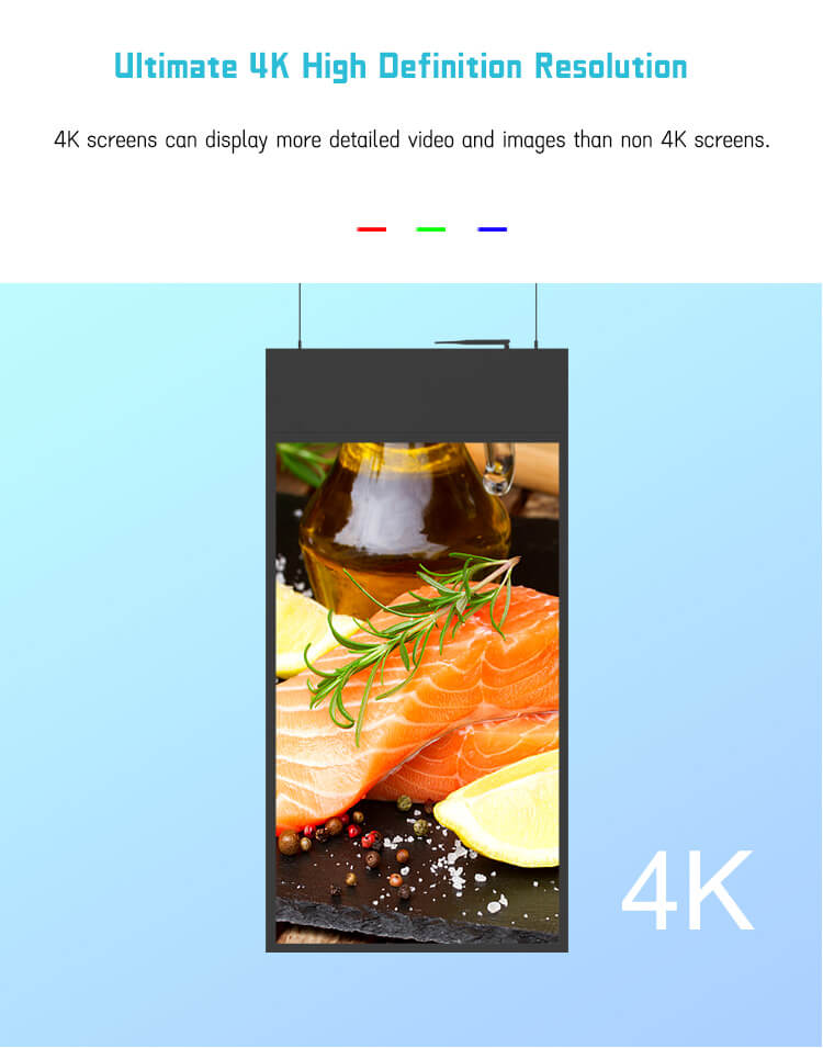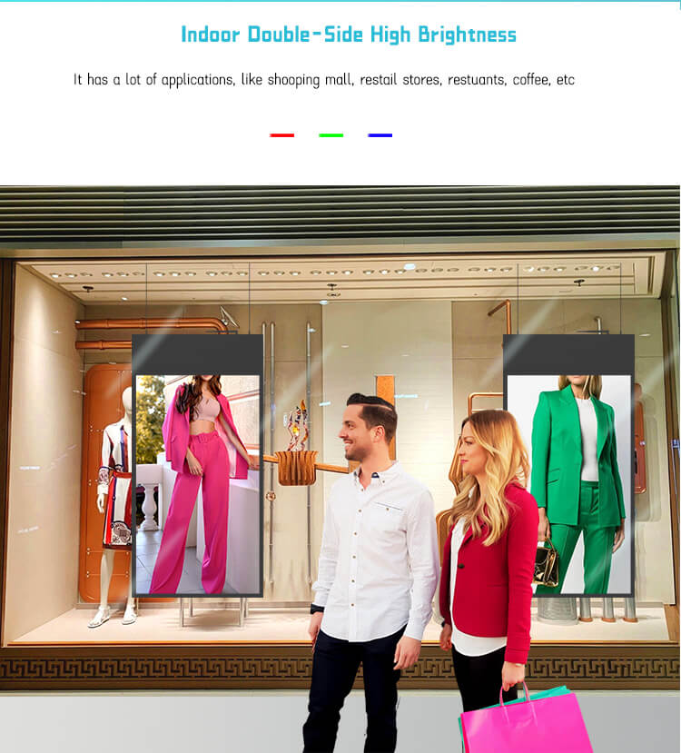 Hanging double-sided display digital signage, 43“, 49”, 55”, 700 nit on one side, 350 Nit on the other side, ultra-thin 20 mm thickness, Android system memory 2g and 16g, Internet remote switch, remote software operation screen to change the content, wake up LCD screen, resolution 1920*1080. Screen weight 32 kg, support customized pattern LOGO, used in supermarkets, shopping malls, department stores, hotels, high-speed rail, airports and so on. Hotels, high speed trains, airports, etc. We are the distributor. We have professional production technology and high quality team. High quality and low price.