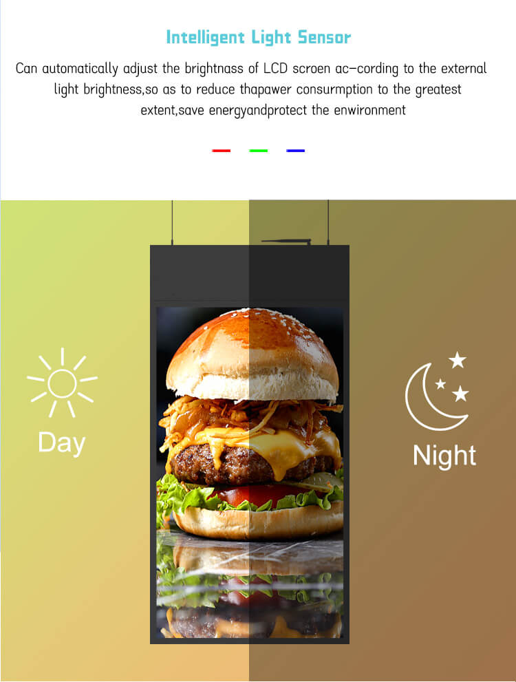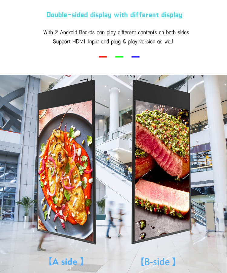 Custom branding 43 / 49 / 55 inch indoor double-sided hanging advertising display window ceiling LCD TV screen digital signage kiosk for supermarkets, shops and more.
